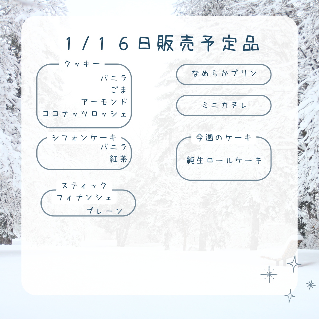 ❄️1月16日販売予定❄️ 2026年1月16日 最終更新日時 : 2026年1月16日 Sucre(admin) 本日の販売予定品です❄️お休み明け、久しぶりの営業となります。 定番のお菓子に、今週は 純生ロールケーキ もご用意します🍰寒い日が続きますが、おやつ時間のおともに選んでいただけたらうれしいです☺️ ※数に限りがありますので、売り切れの際はご容赦ください。