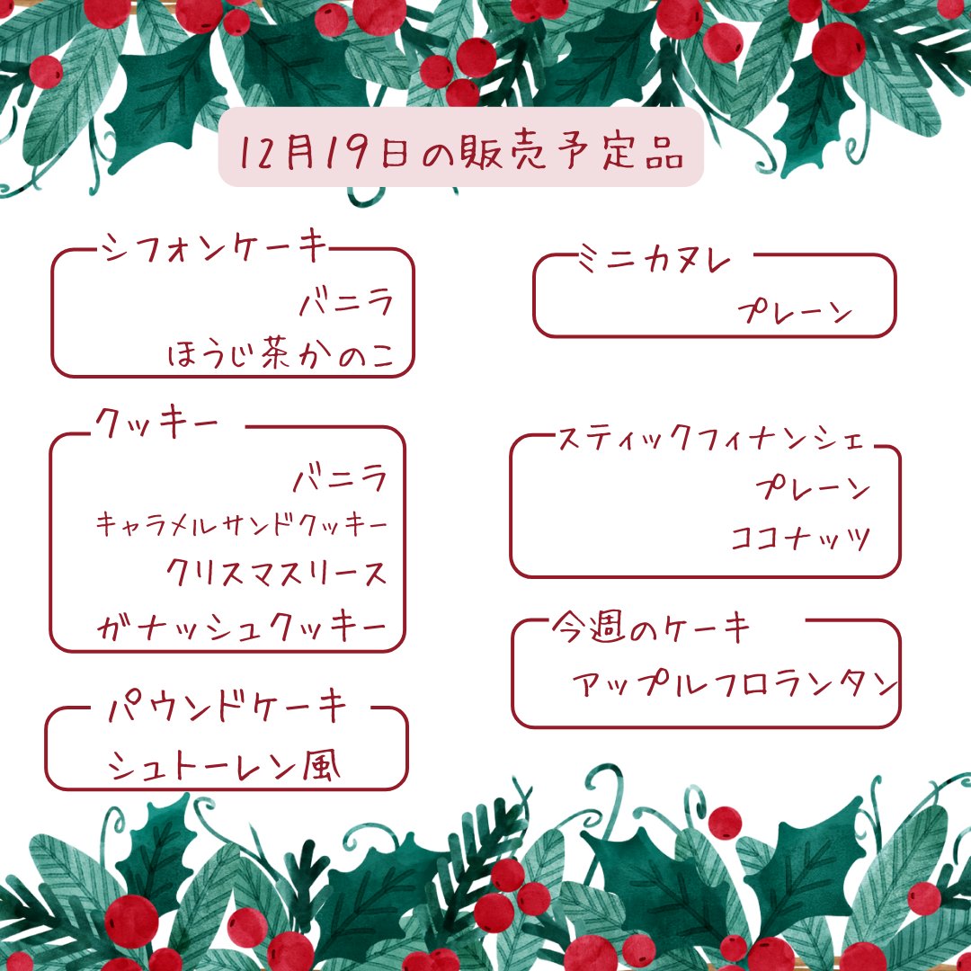 ❄️12月19日販売予定❄️ 2025年12月19日 最終更新日時 : 2025年12月19日 Sucre(admin) 本日の販売予定です☺️🎅 ふんわりシフォンに、クリスマス気分のクッキーたち🎄🍪リースクッキーも並びます✨ シュトーレン風パウンドやココナッツのフィナンシェ、今週のケーキはアップルフロランタン🍎🤍 ちょっとしたご褒美にも、贈りものにもおすすめです🎁✨