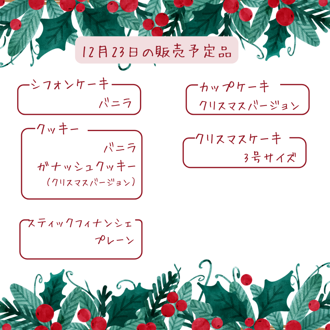 バニラのシフォンやクッキー、クリスマスバージョンのカップケーキも並びます。