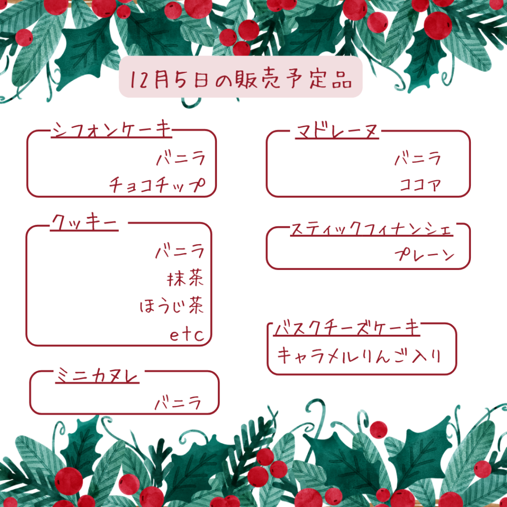 ❄️12月5日販売予定❄️ 2025年12月5日 最終更新日時 : 2025年12月5日 Sucre(admin) 本日の販売予定です☺️冬のひんやりとした空気に、ほっと寄り添うようなやさしい味わいのお菓子たちをそろえました。 バニラ香るシフォンやカヌレ、しみじみ美味しいクッキーやフィナンシェも並びます🍪✨キャラメルりんご入りのバスクチーズケーキもご用意しています🍎🧀 今日のおやつ時間が、ふんわり心あたたまるひとときになりますように⛄️🫧