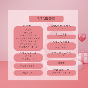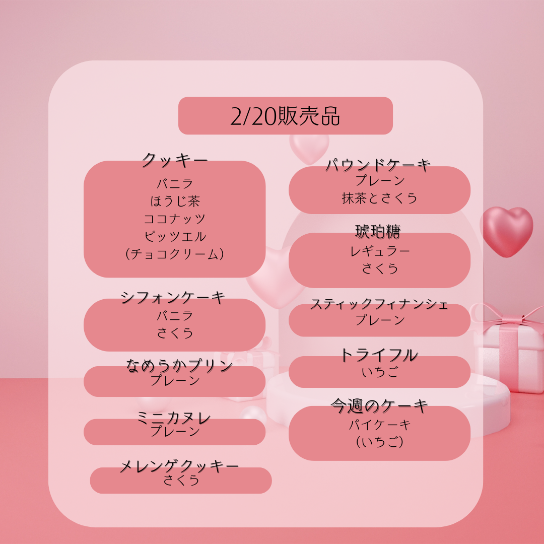 🌸2月20日販売予定🌸 2026年2月20日 最終更新日時 : 2026年2月20日 Sucre(admin) さくらのお菓子が登場しました✨クッキーやシフォン、パウンドケーキになめらかプリンやミニカヌレもご用意しています🍪 今週のケーキは🍓いちごのパイケーキ🍓 少しずつ春を感じるおやつで、ほっとひと息しませんか☺️🌷ぜひSucreへお立ち寄りください✨