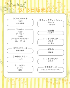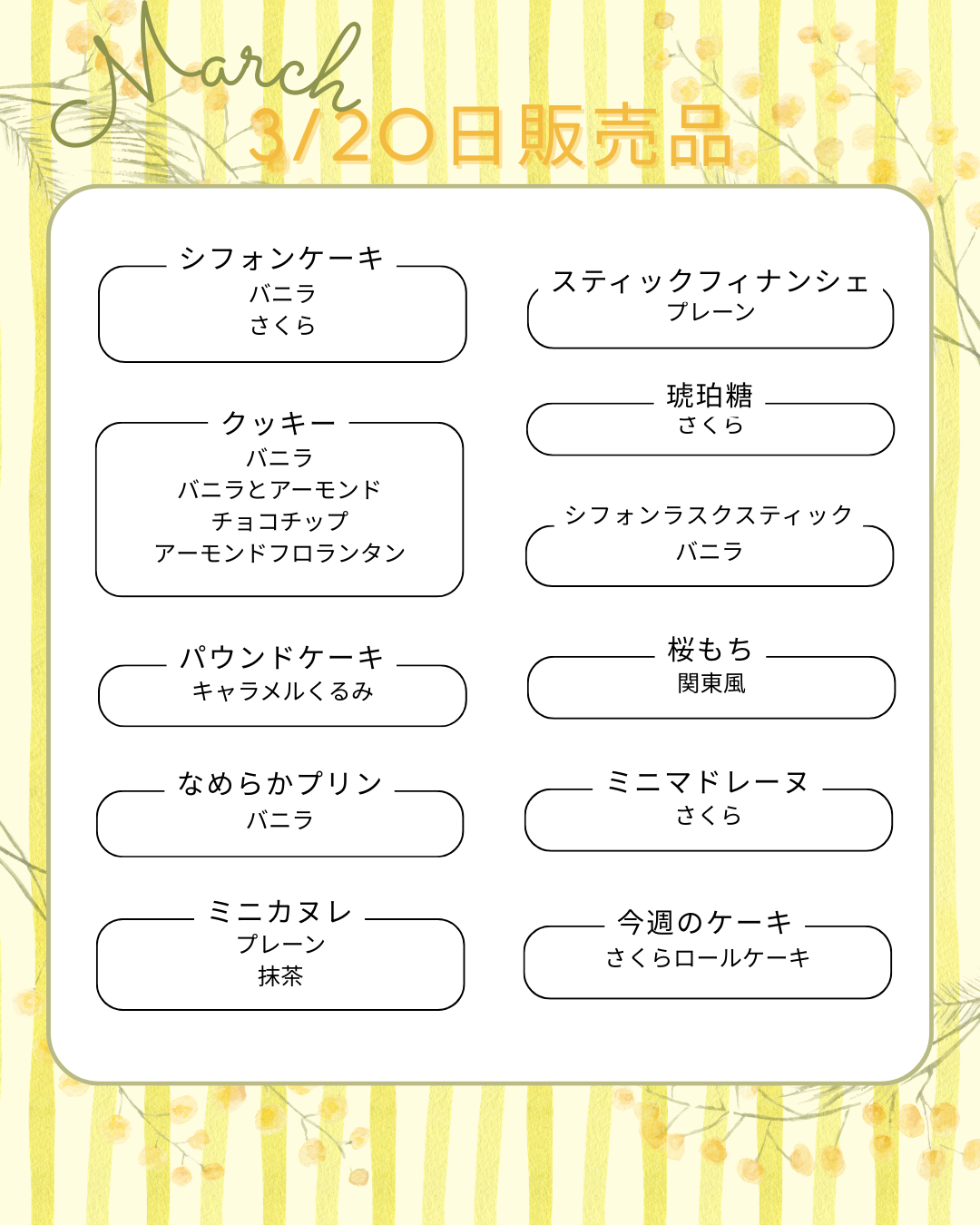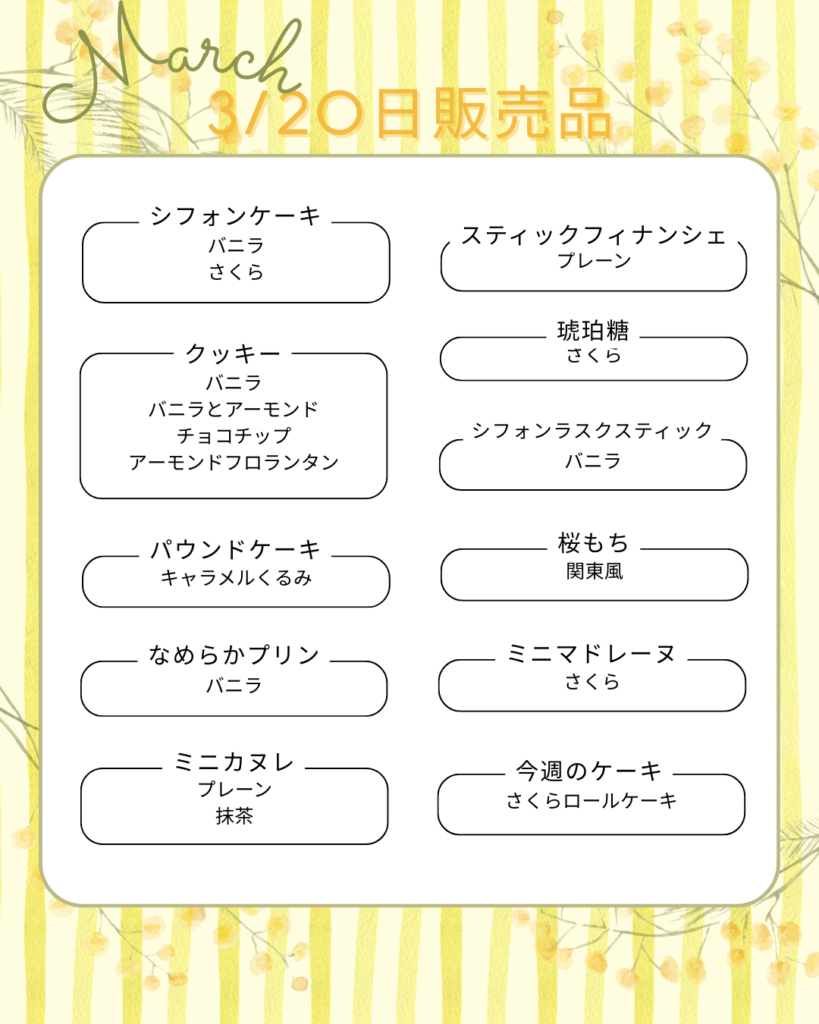 🌿3月20日販売予定🌿 2026年3月20日 最終更新日時 : 2026年3月20日 Sucre(admin) 🌸さくらロールケーキあります🌸 今週のケーキはさくらロールケーキ☺️✨ふんわり春を感じるやさしい味わいです🌷 シフォンケーキやクッキー、なめらかプリンやミニカヌレなど 今日もいろいろご用意しています🍪 桜もちやさくらのお菓子も並んでいますので、春のおやつ時間にぜひどうぞ🌸 Sucreの甘いひとときでほっとひと息しませんか☕✨ご来店お待ちしております☺️💗