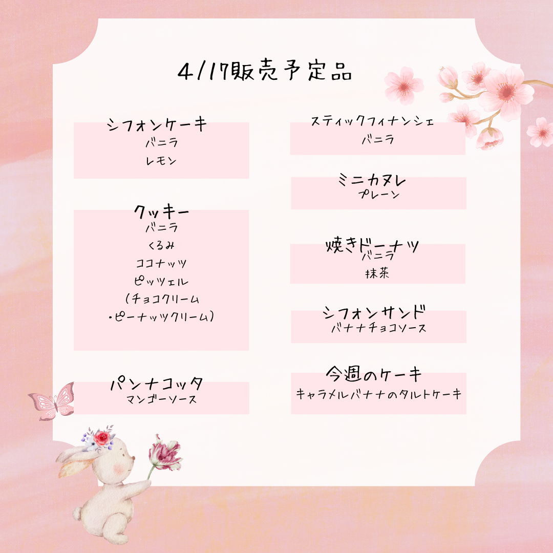 🌿4月17日販売予定🌿 2026年4月17日 最終更新日時 : 2026年4月17日 Sucre(admin) ふわふわシフォンに、サクサククッキー🍪ころんとかわいいミニカヌレや焼きドーナツも並びます🧁✨ 今週は🍌キャラメルバナナのタルトケーキも登場♡ やさしい甘さにほっこりするラインナップでお待ちしてます🐰🌷 お気に入りを見つけにきてね💗