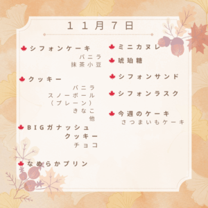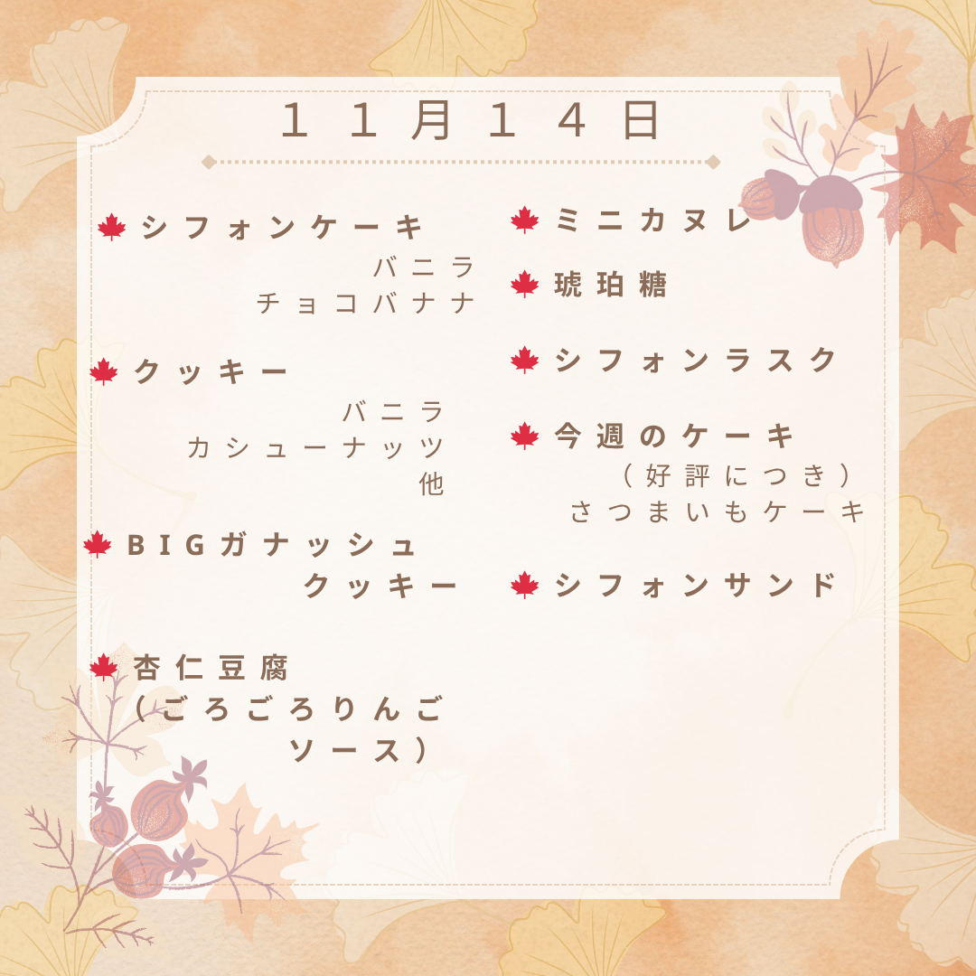 🍁 11月14日 販売予定 🍁 2025年11月14日 最終更新日時 : 2025年11月14日 Sucre(admin) 🍂本日の販売予定です🍂人気の「さつまいもケーキ」「BIGガナッシュクッキー」は、今週もご用意しています🍠シフォンやクッキー、杏仁豆腐など秋のおやつにぴったりのラインナップです。ぜひお立ち寄りくださいませ☺️🍁