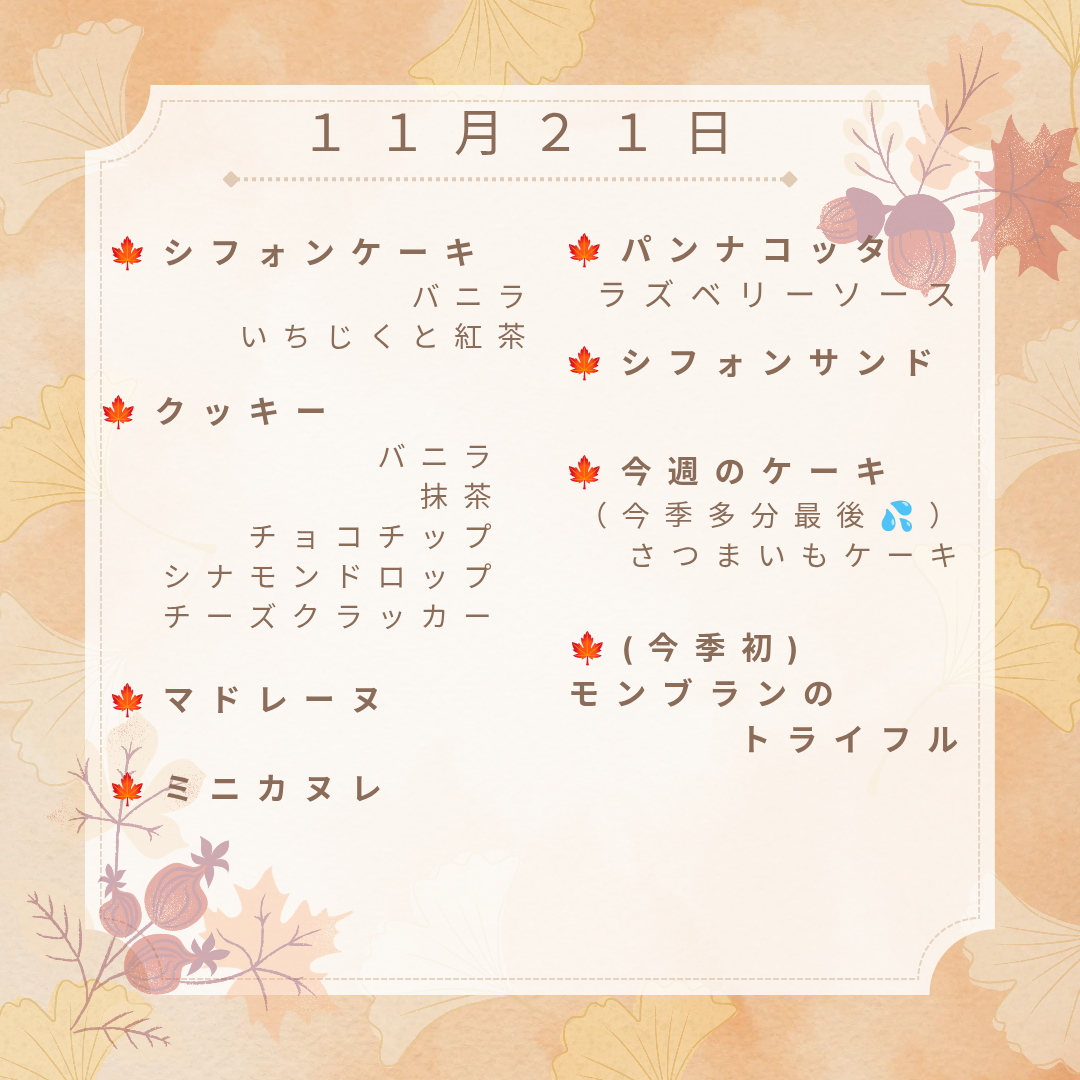 やさしい甘さのシフォンや、ほっとする焼き菓子たちを秋の香りと一緒にご用意します🍁