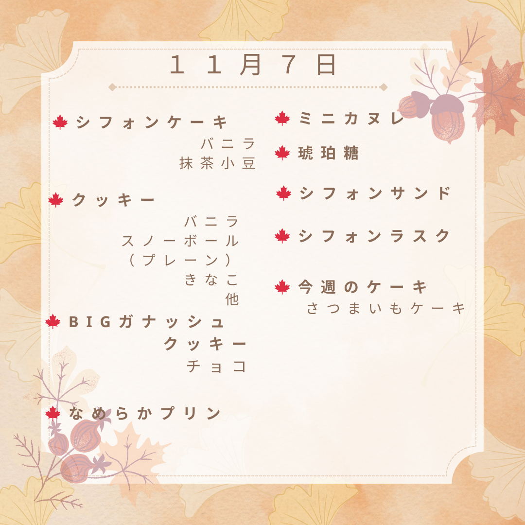 🍁 11月7日 販売予定 🍁 2025年11月6日 最終更新日時 : 2025年11月6日 Sucre(admin) 🍂明日の販売予定です🍂秋の味覚たっぷり、焼き菓子とシフォンをご用意しています。やさしい甘さの「さつまいもケーキ」も登場🍠ぜひお立ち寄りください✨