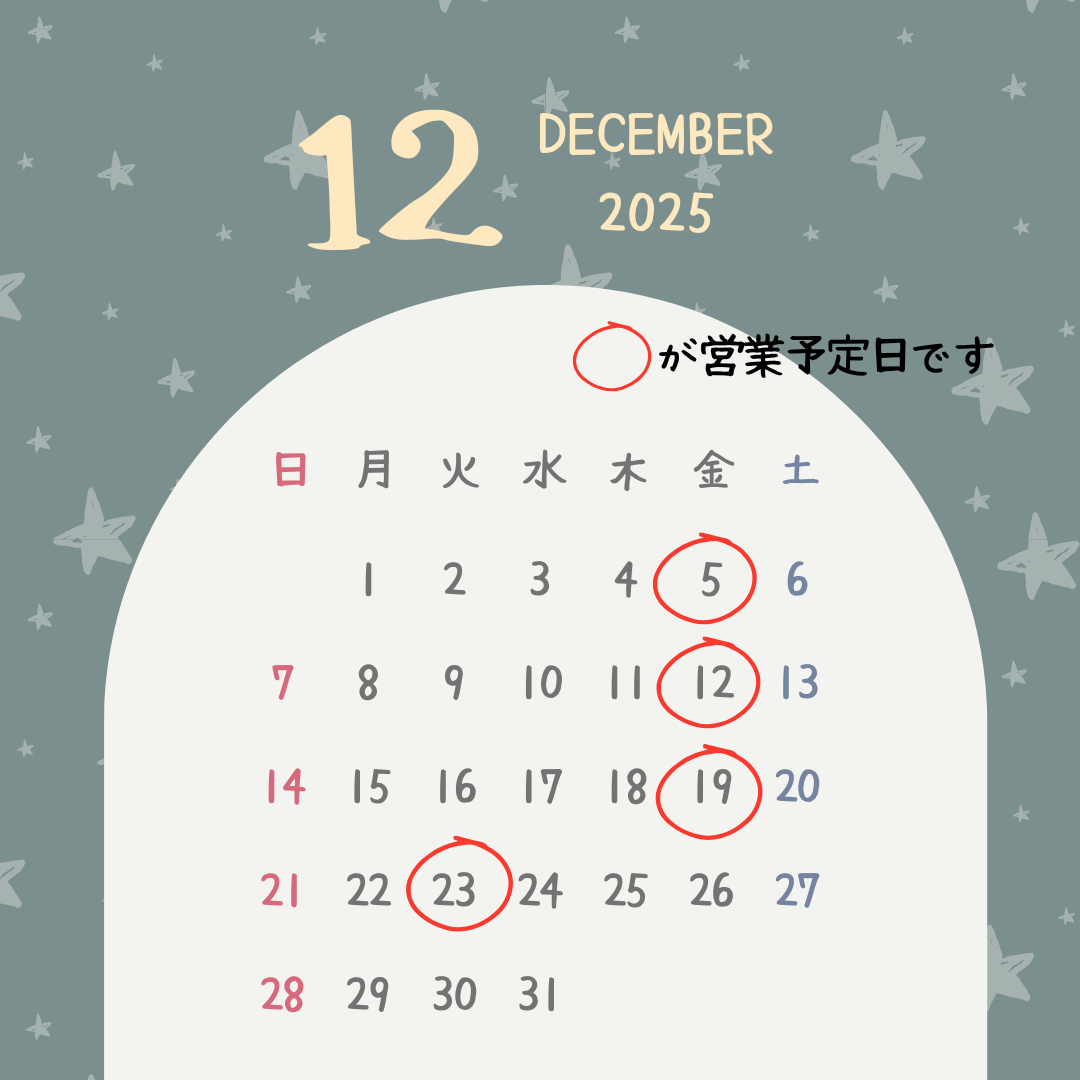 🗓️✨2025年12月の営業予定日です♪ 2025年12月3日 最終更新日時 : 2025年12月3日 Sucre(admin) 直前に変更になることもありますので、ご来店の前に カレンダー(https://sucre.fun/calendar/)または SNSをチェックしてくださいませ。