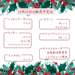 本日の販売予定です☺️🎄 クリスマス仕様のお菓子たちを、いろいろご用意しました🎁✨バニラのシフォンやクッキー、クリスマスバージョンのカップケーキも並びます。 3号サイズのクリスマスケーキもございます🎂そして本日が、今年最 […]
