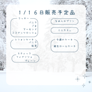 本日の販売予定品です❄️お休み明け、久しぶりの営業となります。 定番のお菓子に、今週は 純生ロールケーキ もご用意します🍰寒い日が続きますが、おやつ時間のおともに選んでいただけたらうれしいです☺️ ※数に限りがありますの […]